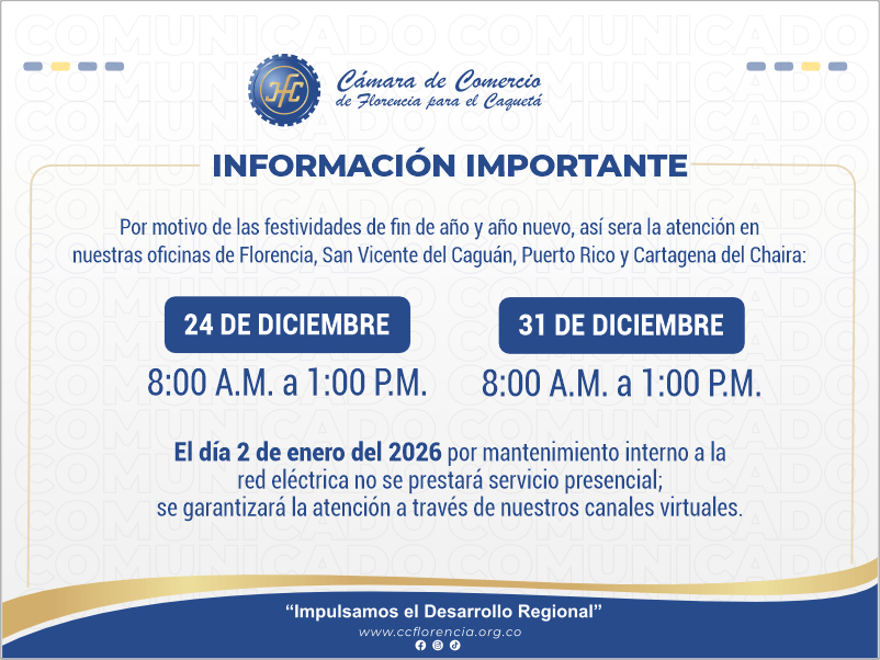 Atención comerciantes y empresarios !!! La Cámara de Comercio de Florencia para el Caquetá informa los horarios especiales de atención para el 24 y 31 de diciembre: 8:00 a.m. a 1:00 p.m. Además, el 2 de enero de 2026 no habrá atención presencial por mantenimiento interno de la red eléctrica, pero estaremos disponibles a través […]